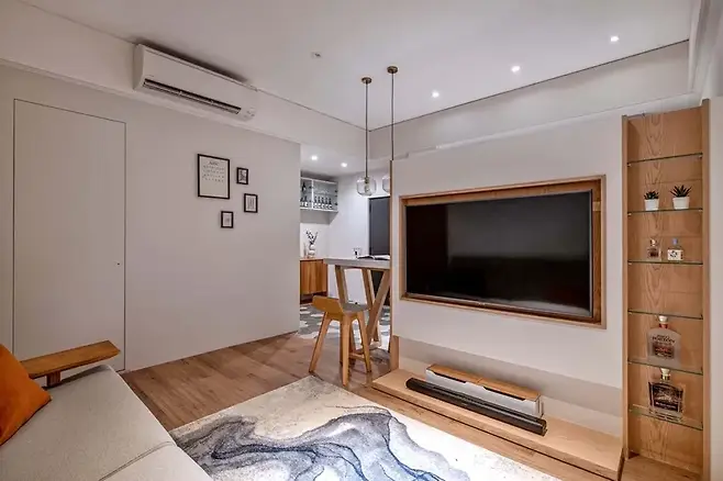 팬트리를 활용한 수납은 AV 케이블을 완전히 숨겨 깔끔한 분위기를 자아내며, 매립형 TV는 벽처럼 조용히 존재한다.