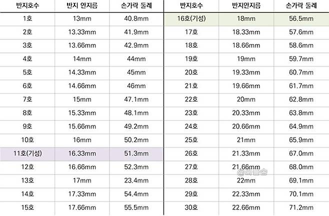 5. 확인: 아래의 ‘KS 규격 반지 사이즈 조견표’에서 측정한 길이에 해당하는 호수를 찾으면 끝!