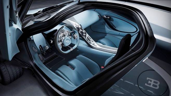 외관 디자인은 전투기를 연상시키는 부가티 특유의 스타일이 기반이다. 중앙에 배치된 와이퍼와 독창적인 도어 디자인이 눈길을 끈다.