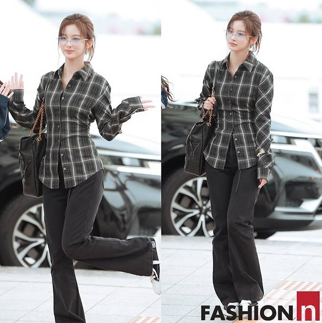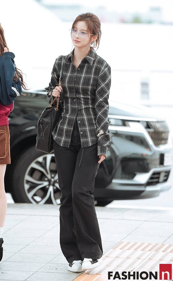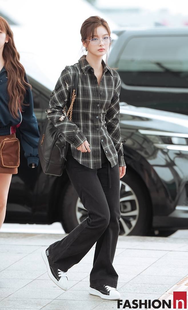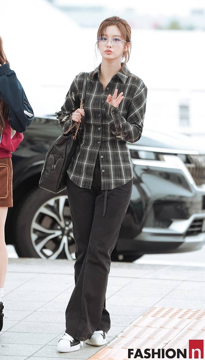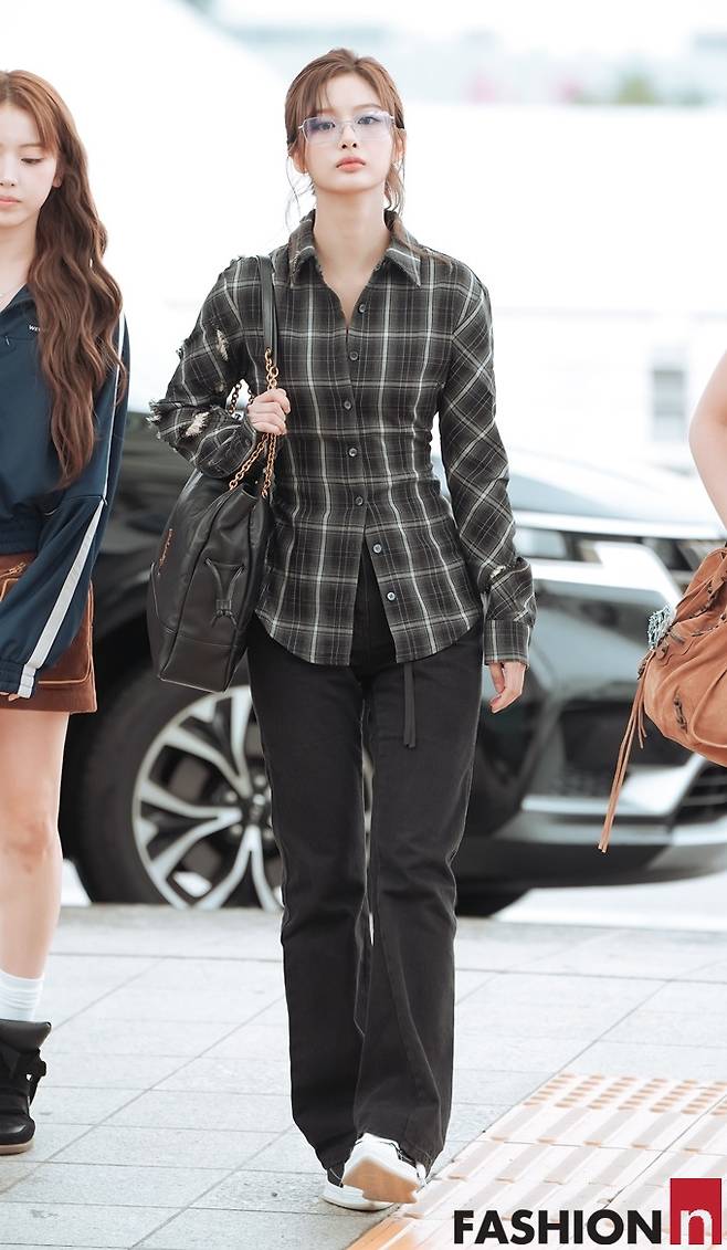 그룹 엔믹스(NMIXX) 설윤이 잘록한 허리 라인이 드러난 체크 셔츠 출국룩으로 시선을 사로잡았다.