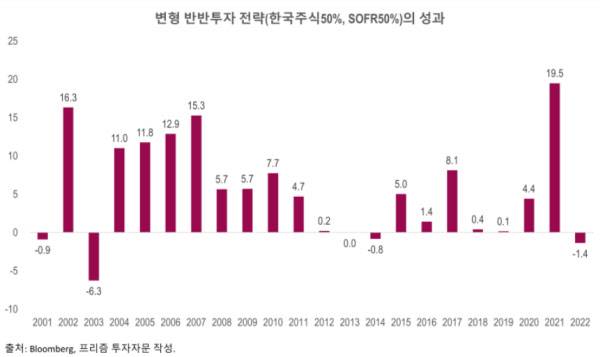 “반반 투자 전략이다. 2030세대들한테 추천하는 전략이다. 매달 모으고 있는 돈을 월 100만원으로 가정해보자. 그러면 50만원은 한국 주식, 50만원은 달러에 투자하는 전략이다. 이 전략의 장점은 불황에도 대비할 수 있다는 점이다. 여기서 한국 주식은 개별종목이 아니고 인덱스, 코스피 200지수, 달러는 SOFR을 기준으로 말했다. SOFR은 외화 예금을 상장해 놓은 상품이다.”