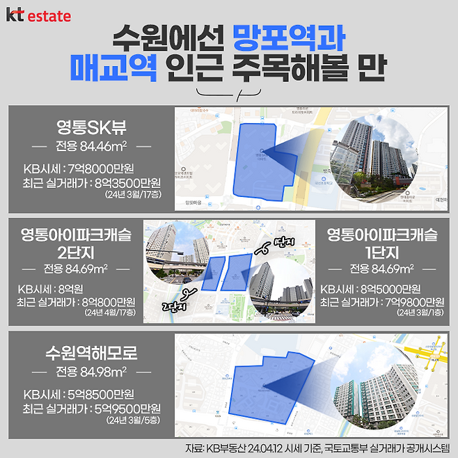 망포역 인근보다 저렴한 곳을 찾는다면 매교역 인근도 고려할 만합니다. ‘수원역해모로’아파트는 2015년 준공된 올해 10년차 총 863가구 아파트로, 매교역을 도보로 이용할 수 있으며, 세류초를 품은 초품아입니다. 이 단지 전용 84㎡는 KB시세 일반평균가로 5억8500만원이며, 3월 실거래가(5층)가 5억9500만원, 매물 평균가는 6억2042만원입니다.