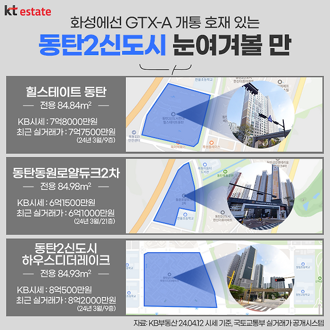 화성에서는 GTX-A 개통 호재가 있는 동탄2신도시에서 매수를 고려해 볼만한 단지를 찾아봤습니다. 다만 동탄역이 있는 북동탄은 가격대가 비싸 상대적으로 저렴한 남동탄 지역에서 초품아 단지 위주로 선정했습니다.