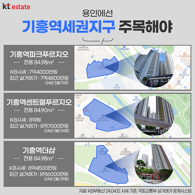 ‘기흥역파크푸르지오’는 현재 전용 84㎡가 KB시세 일반평균가로 7억4000만원이며, 3월 실거래가(11층)가 7억4800만원, 매물 평균가는 7억9406만원입니다. ‘기흥역센트럴푸르지오’ 전용 84㎡는 KB시세 일반평균가로 8억원이며, 최근 실거래가(3월 / 34층)가 8억7000만원, 매물 평균가는 8억6672만원입니다. ‘기흥역더샵’ 전용 84㎡는 KB시세 일반평균가로 8억4500만원이며, 최근 실거래가(2월 / 39층)가 8억6000만원이었습니다. 매물 평균가는 8억8952만원으로 3개 단지 중 가장 높게 형성돼 있습니다.