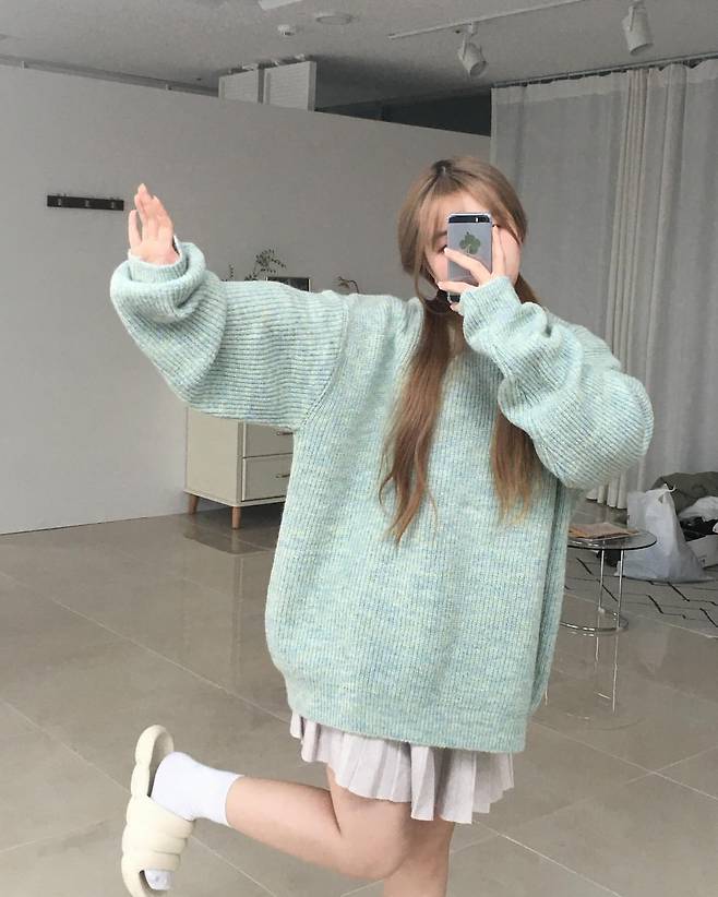 세 번째 사진에서는 민트 컬러의 오버사이즈 니트와 플리츠 미니스커트를 매치해 사랑스러운 분위기를 연출했다. 크림색 슬리퍼와 양말 조합은 편안함과 귀여움을 동시에 살렸다. 전체적으로 부드러운 색감과 실루엣이 조화를 이루며 따뜻한 실내 공간과 잘 어울리는 코디를 보여준다.