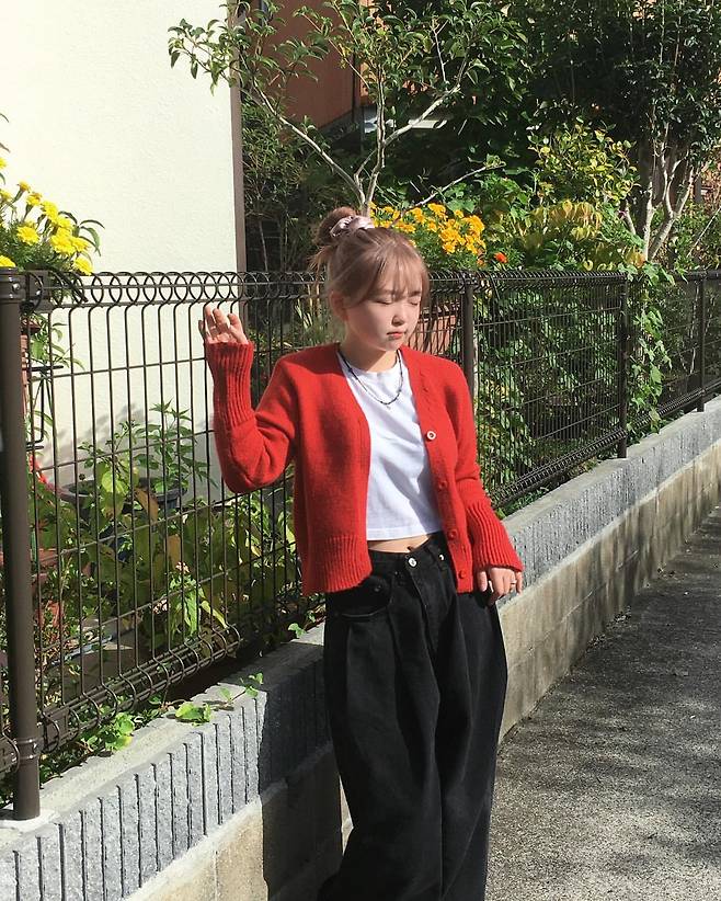 그녀는 화이트 크롭티와 블랙 와이드 팬츠에 레드 컬러의 니트 가디건을 걸쳐 강렬한 색감 대비로 시선을 사로잡는다. 여기에 자연스럽게 묶은 헤어스타일과 은은한 액세서리로 디테일을 더하며, 가을 감성이 물씬 느껴지는 스트리트룩을 선보였다.