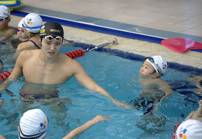 [서울=뉴시스] 김진아 기자 = 한국수영의 간판 김우민이 9일 경기 고양시 서울YMCA 고양국제청소년문화센터에서 열린 '라커 룸 위드 팀 CJ : 스윔 투 드림'에서 초등부 선수 등 참여 학생들에게 수영 멘토링을 하고 있다. (사진=CJ 제공) 2024.11.09. photo@newsis.com *재판매 및 DB 금지