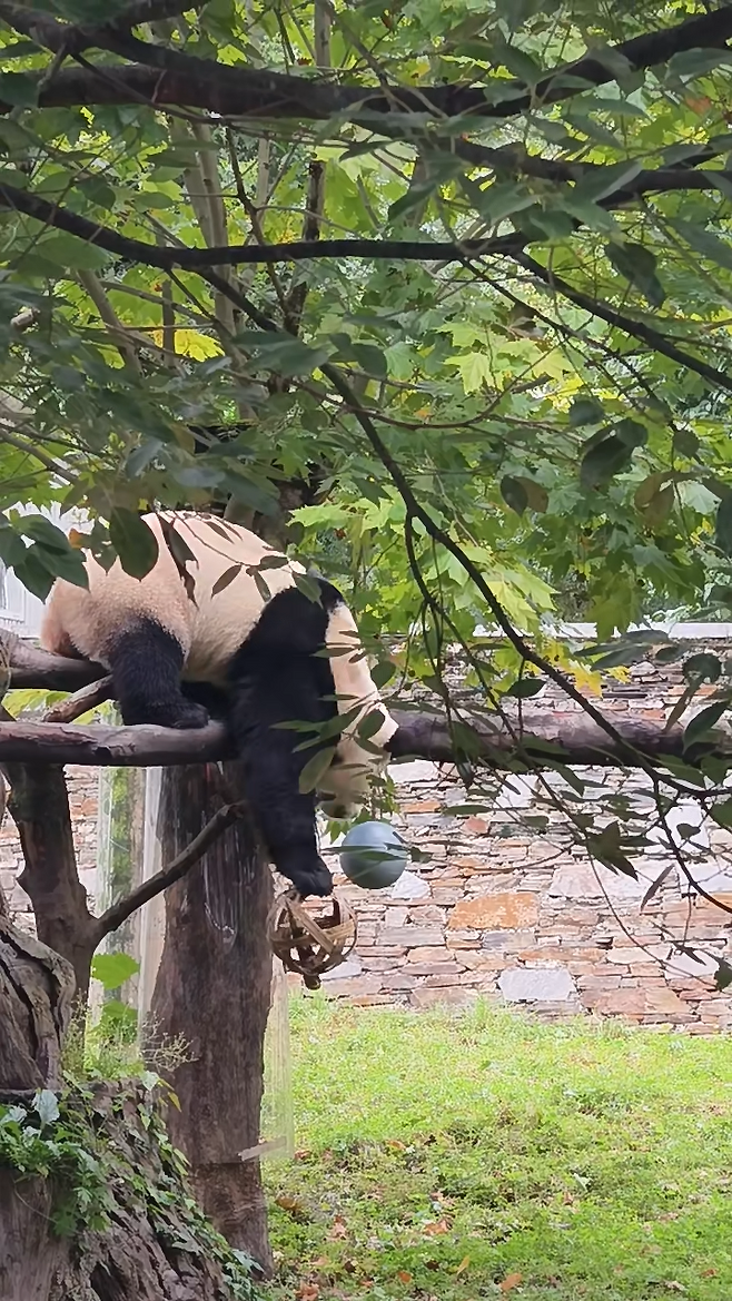 두 뒷발로 서서 높은 곳에 있는 먹이를 잡아채는 것보다, 위에서 아래로 잡는 게 편하다는 걸 안 걸까요? 푸바오는 플레이봉 위로 올라가서 안전하게 자리를 잡더니, 앞발을 쭈욱 뻗어 아래에 있는 공을 가져왔습니다.