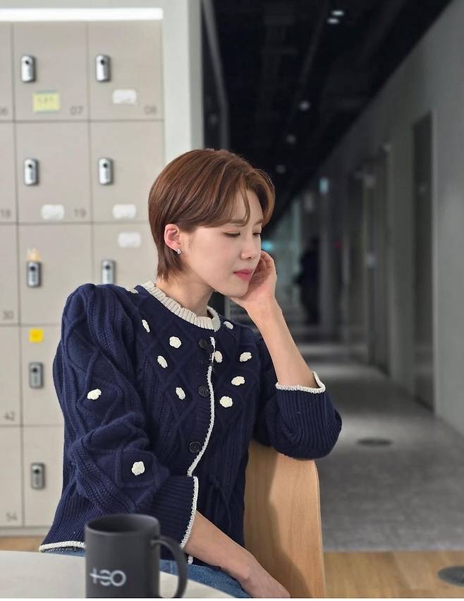 장도연이 네이비 컬러의 꽈배기 니트 카디건을 중심으로 클래식하고 단정한 분위기를 연출했습니다.