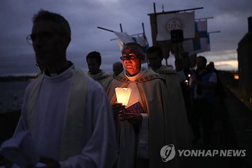 A member of the clergy holds a candle during a processional from the Saint-Vincent Cathedral of Saint-Malo to observe the Assumption of Mary, Thursday, Aug. 15, 2024, in Saint-Malo, France. (AP Photo/Lindsey Wasson) AUG. 15, 2024, PHOTO, STAND ALONE