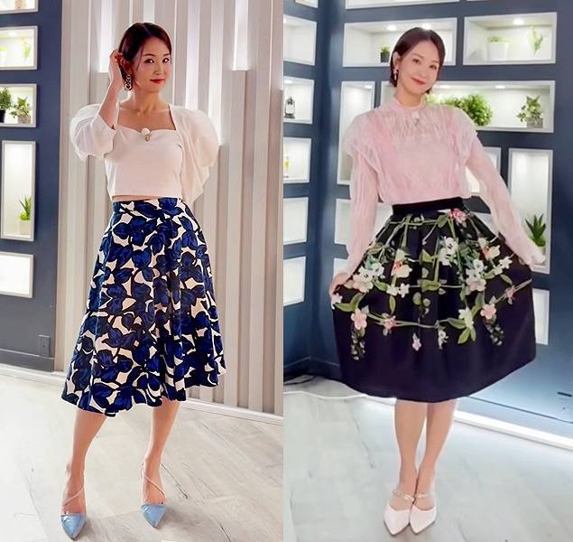 오정연은 각각 다른 패턴의 스커트를 착용하며 여성스러운 매력을 극대화했습니다.