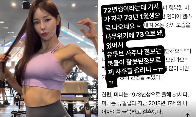 지난 13일 미나는 자신의 계정에 "72년생이라는데 기사가 자꾸 73년 1월생으로 나오네요~"라는 글을 업로드했다.