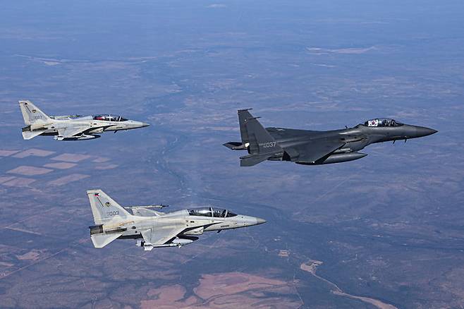 [서울=뉴시스] 김금보 기자 = 한국 공군 F-15K와 필리핀 공군 FA-50PH가 호주 다윈기지 상공에서 우정비행하고 있다. 이번 피치블랙 훈련에 함께 참가한 양국 공군의 F-15K와 FA-50PH는 31일(현지시간) 호주 다윈기지 상공에서 우정비행을 실시했다. (사진=공군 제공) 2024.07.31. photo@newsis.com *재판매 및 DB 금지