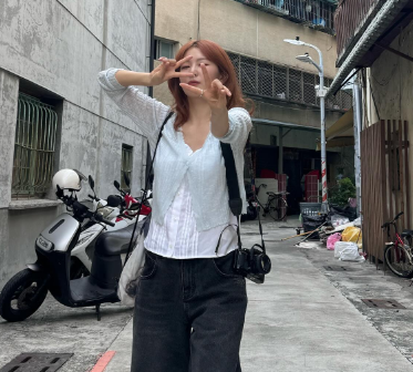 상의로는 하얀색 블라우스 재질의 나시를 착용해주어 가볍고 시원한 패션을 완성했습니다.