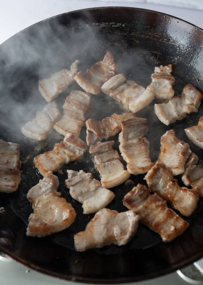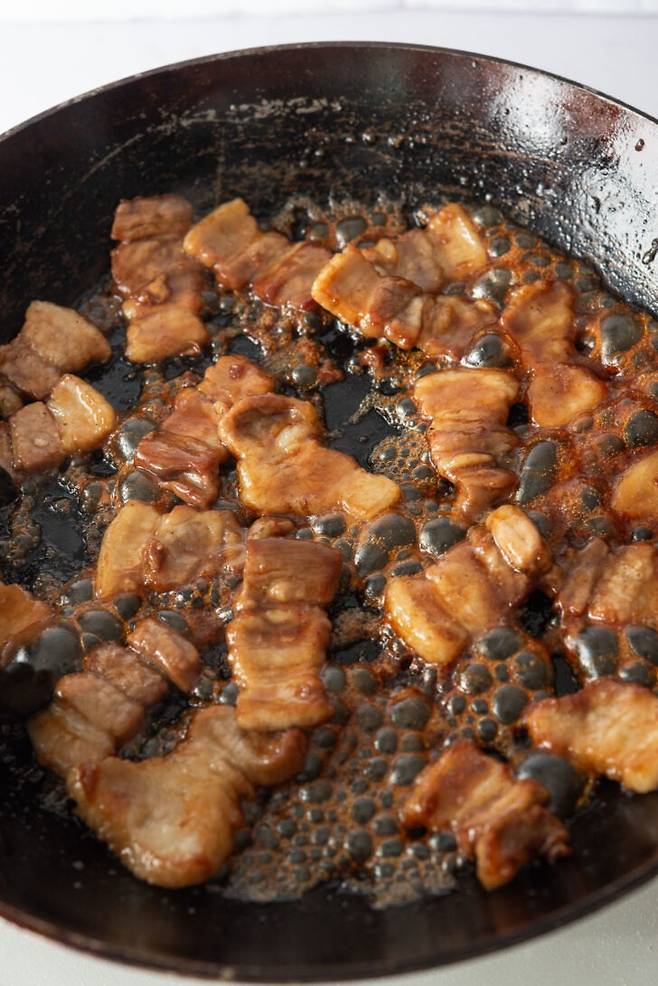 3. 같은 팬에 삼겹살을 올려 앞뒤로 노릇하게 구운 뒤, 준비한 소스를 넣고 중불에서 졸인다.