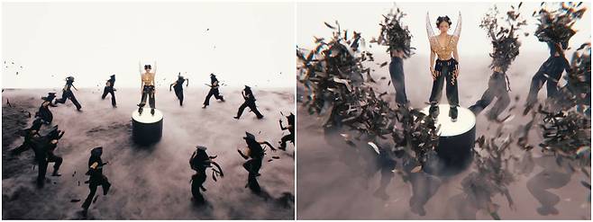 뮤직비디오에서 검은색은 불교에서 말하는 번뇌와 망상을 상징합니다. 초반부, 검은 옷을 입은 인물들이 등장하는 장면에서 "Cross me please"라는 가사와 함께 혼란과 위협이 제니를 향해 다가오죠. 하지만 이에 굴하지 않고 제니는 "I’ma keep it Z, ZEN"이라 선언합니다. 여기서 'Z'는 알파벳의 마지막 글자, 즉 끝을 의미하는 동시에, ‘ZEN(선)’과 겹쳐지며 완전한 깨달음을 끝까지 지키겠다는 의지를 보여줍니다. 어떤 혼란이 닥쳐와도 자신의 신념과 본질을 굳건히 지키겠다는 강한 메시지가 담긴 장면이라고 볼 수 있겠네요!