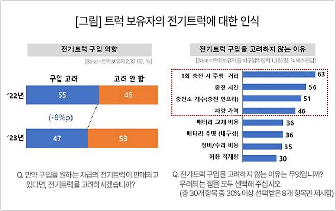 트럭 보유자 중 원하는 차급의 전기트럭이 판매되고 있다면 ‘구입을 고려하겠다’는 응답자는 47%였다. 전년(’22년)의 55%에서 1년만에 8%포인트(p) 떨어졌다. 구입의향이 수년간 급증하다가 지난해 큰 폭으로 하락한 전기승용차 시장의 추이와 일치한다(참고. 자동차 구입의향, 전기차 폭락…하이브리드 급등).