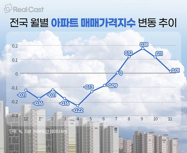 KB부동산 시계열 자료에 따르면, 전국 아파트 매매가격은 지난해 12월 대비 -0.46% 하락한 것으로 나타났습니다. 2023년 -6.72% 떨어진 것에 비하면 하락폭은 많이 줄었는데요. 지난 3월 -0.16%, 4월 -0.22% 등 상반기는 하락이 계속됐고, 이후 하반기는 8월 0.12%, 9월 0.18%로 회복세를 보였습니다.