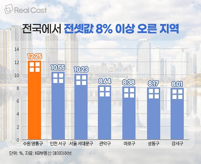 수원 영통구 전셋값 가장 많이 상승, 인천 서구·서울 서대문구도 10% 이상 ↑