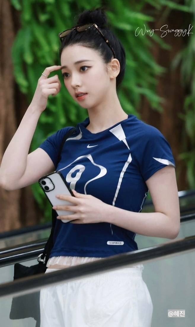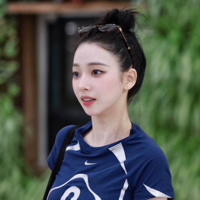 살짝 크롭한 기장의 남색 반팔 티셔츠는 활동적이면서도 여성스러운 실루엣을 살려줍니다. 흰색 롱스커트는 자연스럽게 퍼지는 라인으로 스포티함과 청순함을 동시에 느끼게 해주죠. 카리나는 여기에 시원한 똥머리와 선글라스를 매치하여 완벽한 여름 공항패션을 완성했습니다. 같은 여자가 봐도 너무 예뻐서 한참을 쳐다보게 만들 정도였답니다!