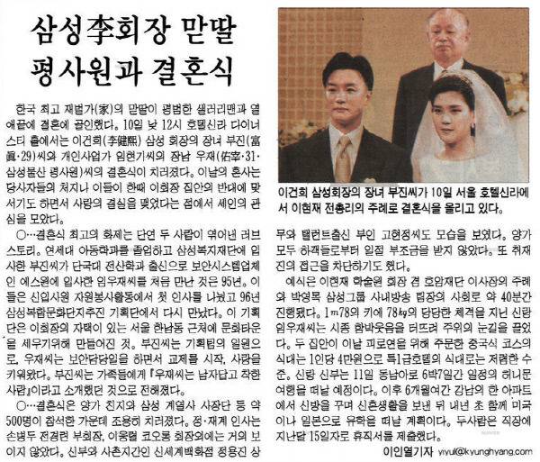 삼성에서 이건희의 말은 곧 ‘헌법’처럼 여겨졌다. 그렇게 1999년 8월, 두 사람은 많은 이들의 축복 속에 부부가 됐다.