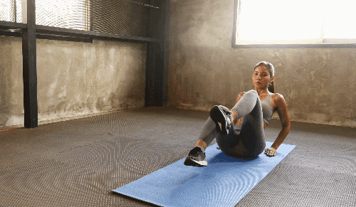 매트에 누워 손을 머리 옆으로 옮깁니다. 무릎을 세우고 발을 바닥에 붙입니다. 다리를 공중으로 들면서 상체를 대각선 방향으로 일으킵니다. 이번에는 다리를 당기면서 상체를 반대편 방향으로 일으킵니다.
