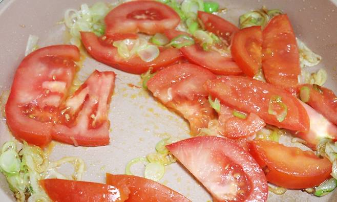- 파향이 올라오면 토마토를 넣고 볶다가 진간장 반스푼, 굴소스 반스푼을 넣어 함께 볶아줍니다.