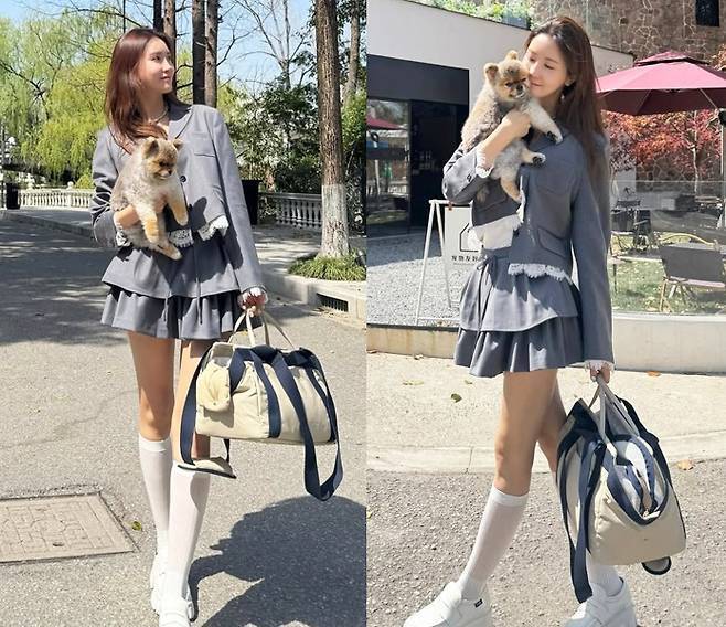 베이지 컬러의 빅백으로 실용적인 무드를 더하고, 품에 안은 귀여운 반려견과 함께 상하이의 햇살 아래 자연스럽게 포즈를 취하며 여전히 변함없는 여신 미모로 팬심을 흔들었습니다.