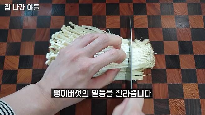 팽이버섯 밑동을 자르고 씻은 뒤 물기를 제거합니다.