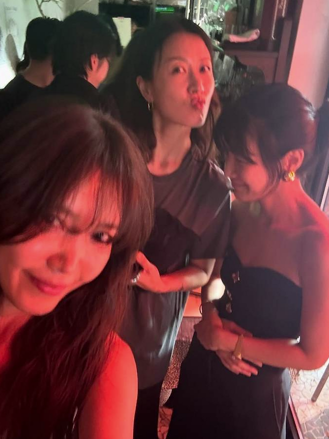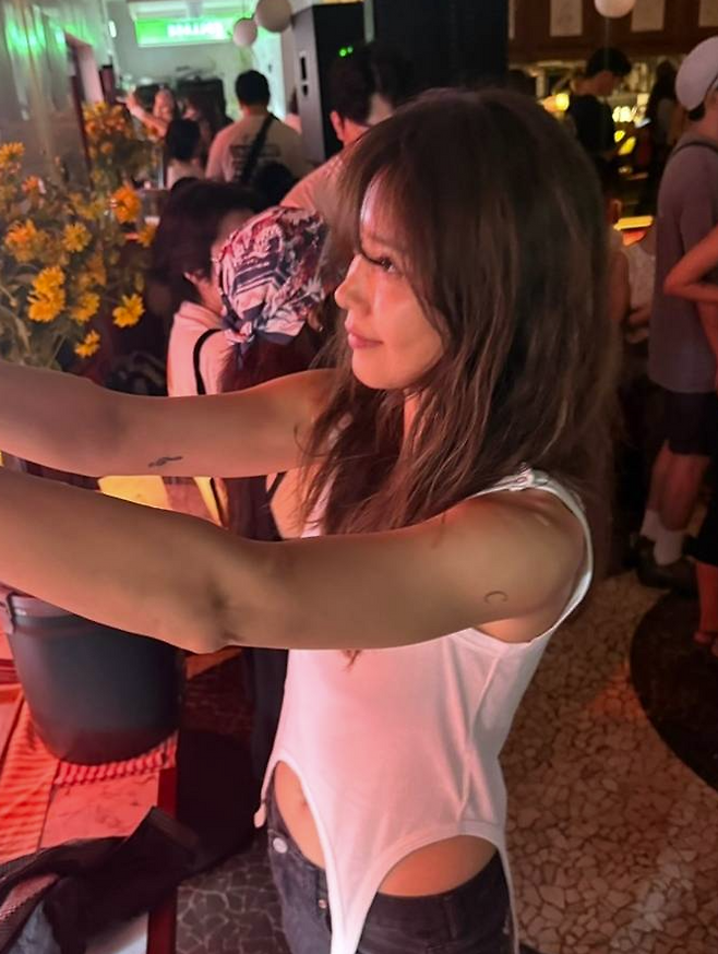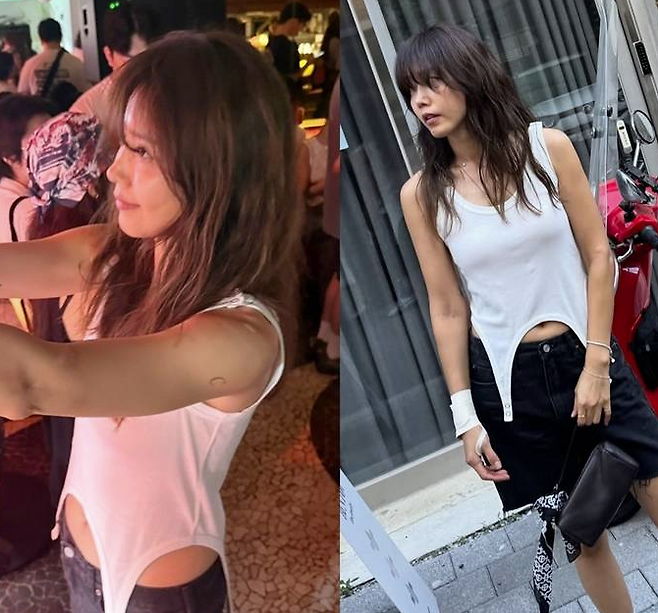 채정안이 한남동에서 힙한 매력을 뽐내며 시선을 싹쓸이했답니다! 그녀는 언밸런스 컷아웃이 돋보이는 화이트 슬리브리스 톱과 블랙 데님 스커트를 매치하여 시크하면서도 유니크한 무드를 완성했어요. 🖤👗