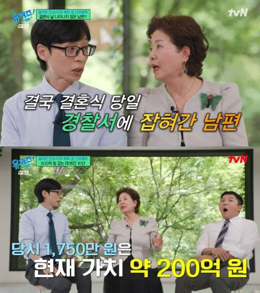 "남편이 풀려날 수 있다"는 말에 선우용여는 보증 서류에 도장을 찍었고, 1750만원 빚을 떠안게 되었다고 합니다. 당시 1750만원은 현재 시세로 약 200억원에 가깝죠.