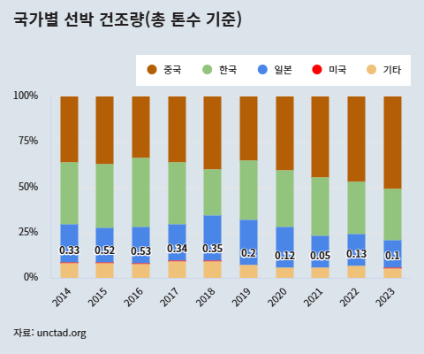 숫자로 비교하면 더 명확한데요. 미국의 선박 생산량은 1950년대보다 85% 감소했습니다. 1970년대엔 전 세계에서 건조된 선박 중 5%가 미국 조선소에서 생산됐는데요(총 톤수 기준). 이젠 고작 0.1% 수준입니다. 그래프를 그리면 아예 보이지도 않을 정도이죠(아래 그래프 참조). 최근 미국 조선소는 상업용 선박을 연간 3~5척을 생산할까 말까인 수준이고요. 당연히 수십년 동안 미국산 대형 선박의 해외 수출은 없었습니다.