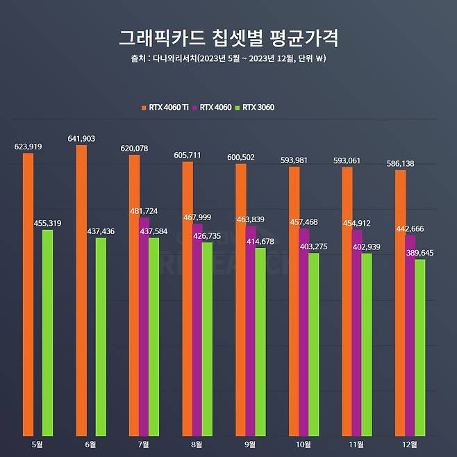 그럼 RTX 4060 Ti는 어느 시점부터 많이 팔리기 시작했을까? 점유율 역전이 시작된 8~9월 사이다. 60만 원 초반대를 유지하던 RTX 4060 Ti가 이 때를 기점으로 이상한 움직임을 보였고, 결국 심리적 저항선이 60만 원대가 깨져버리고 만다. 결국 12월 현 시점에서 RTX 4060 Ti는 출시가보다 37,781원 줄었다. 약 6% 정도 하락한 셈이다.