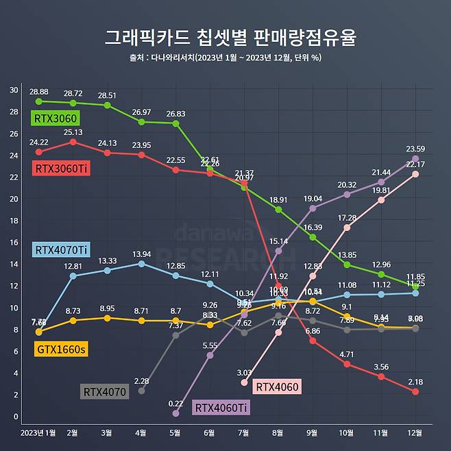 RTX 30 시리즈는 계속 하락세를 탔다. 그러다 2023년 7월을 기점으로 눈썰매라도 탄 것처럼 아주 빠르게 미끄러지기 시작했다. 참고로 경사만 놓고 보면 RTX 3060은 어린이용 눈썰매 코스, RTX 3060 Ti는 성인용 눈썰매 코스다. RTX 3060은 12월 기준으로 11.85%로 내려가 RTX 4070 Ti와 비슷한 점유율이라 치지만, RTX 3060 Ti는 12월 2.18%로 내려가 완벽하게 몰락해버렸다. 참고로 RTX 4070 Ti는 일단은 중급 기종이다. 그런데 RTX 3060과 판매량 점유율이 비슷한 수준이라는 것은, 실질적으로 RTX 30에서 RTX 40 시리즈로 세대교체가 끝났음을 뜻한다.