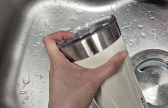 먼저 깨끗이 헹군 텀블러 안에 찬밥을 한 숟갈과 물을 절반정도 넣어준다. 그 상태로 텀블러 뚜껑을 닫고 가볍게 흔들어 내부 벽면에 밥알이 골고루 닿게 해준다.