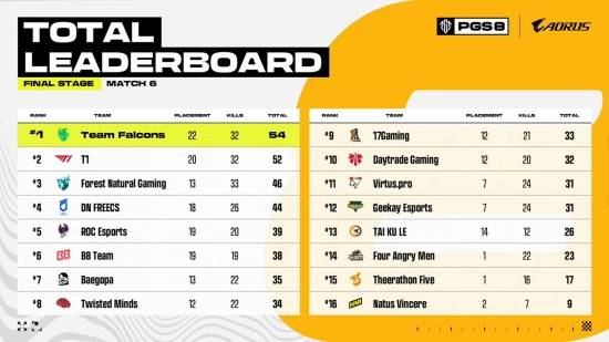 팀 팔콘스, 54점으로 파이널 스테이지 1일 차 1위...T1위 2위·DN 프릭스 4위 (PGS 8)
