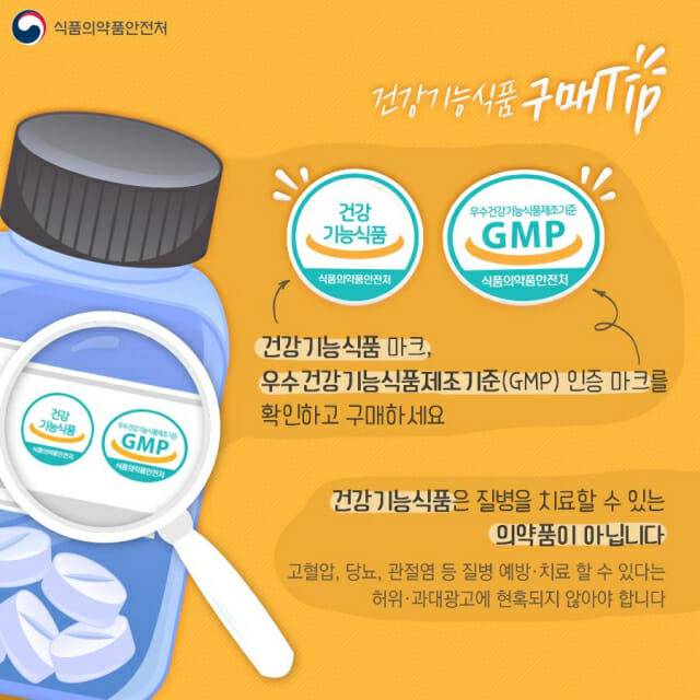 제품 겉면에 식약처의 인증 마크가 있는지 꼭 확인하세요. 특히 해외 온라인쇼핑몰을 통해 직접 구매하는 경우에는 식품에 사용할 수 없는 원료가 들어 있는 경우도 많으니 조심해야 합니다.