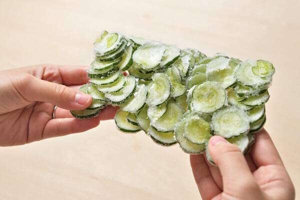 소금에 절이면 오이 속 수분이 일부 빠지면서 냉동 후에도 물러짐을 줄여줍니다. 소금 간이 은은하게 배어 맛을 더하며, 물기를 적절히 제거하면 냉동 중 성에 발생도 억제할 수 있어 아삭한 식감을 더욱 오래 유지할 수 있습니다.