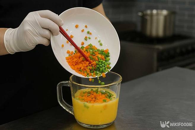 2. 계란 3개를 풀고 고명을 섞는다. 간은 하지 않는다.