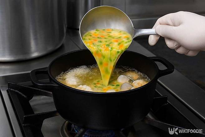 6. 물이 끓으면 계란물을 천천히 부어준다.