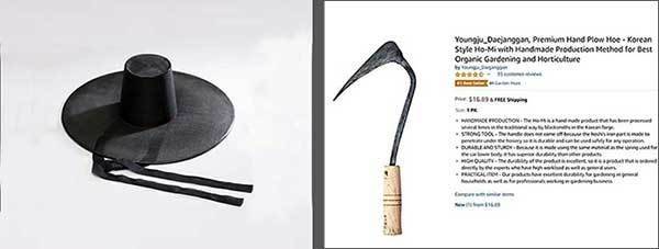 | ▲ 갓과 호미 성인 남자가 나들이할 때 쓰던 갓(왼쪽),?▲ 아마존에서 16.89달러(약 1만 8,800원)에 팔고 있는 호미. ‘영주대장간, 코 리안 스타일 호미’라고 표기되어 있다 (아마존 누리집 갈무리) |