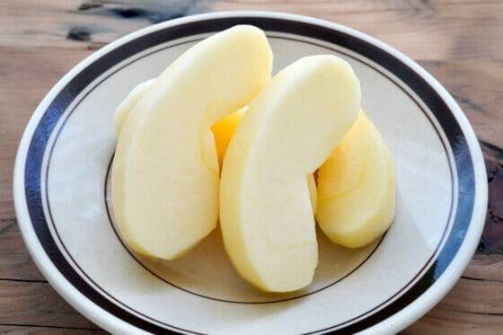 껍질 벗긴 삶은 사과 슬라이스 → 과당 자극 줄이고 위장 부담 ↓
