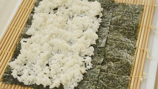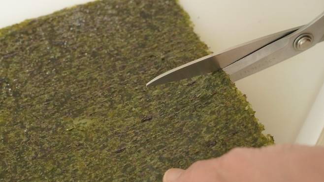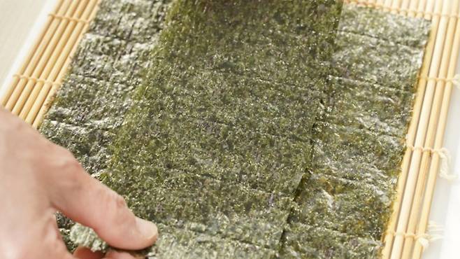 보통 김밥 하나를 말을 땐 김 1장을 이용하게 되는데요. 오늘은 여분의 김 1/2개를 준비하세요. 1/3 정도로 잘라 준비해 주셔도 괜찮아요.