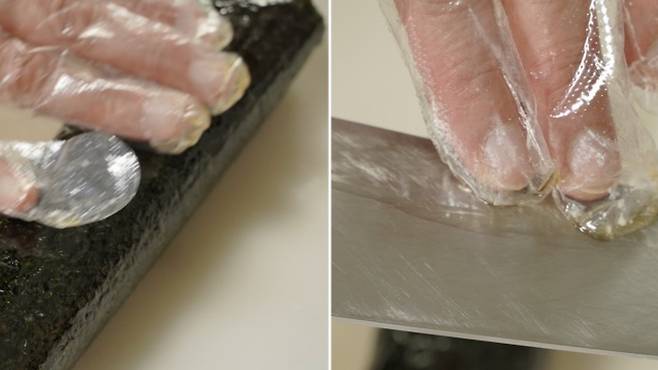 김밥을 잘 말았다면 써는 방법도 굉장히 중요한데요. 김밥을 썰때 그냥 썰게 되면 김밥이 터질 위험이 매우 커요!