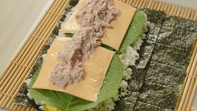 그리고 평소와 같이 준비한 밥을 올리고 재료를 올려 김밥을 말아 주면 되는데요. 이렇게 김 1/2개를 덧대서 만들게 되면 지지대 역할을 해주기 때문에 김밥 옆구리 터질 걱정 없이 썰 수 있어요.