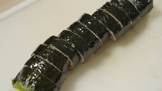 짜잔! 김밥 한 줄을 아주 깔끔하게 썰었어요. 김 반장을 덧대고, 참기름을 이용해 아주 깔끔하게 썰 수 있었답니다.