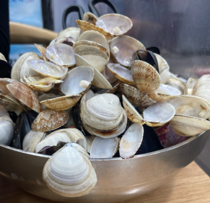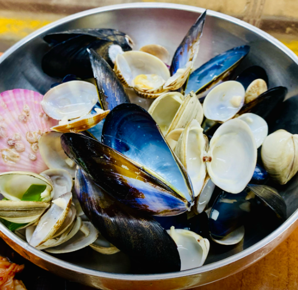 ▶ 조개해물전골(소/중) 29,000원/45,000원 – 각종 조개와 해산물이 푸짐하게 들어가 단체 손님에게 인기