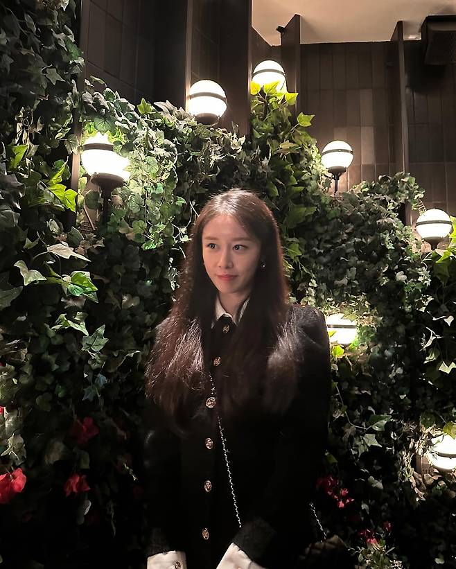 정원의 조명과 어우러진 공간에서 지연은 클래식한 블랙 재킷을 선보이고 있다. 골드 버튼 디테일이 돋보이는 재킷에 화이트 셔츠를 매치해 시크하면서도 세련된 모노톤 스타일링을 완성했다. 체인 스트랩 백으로 포인트를 주어 고급스러움을 한층 더했다.