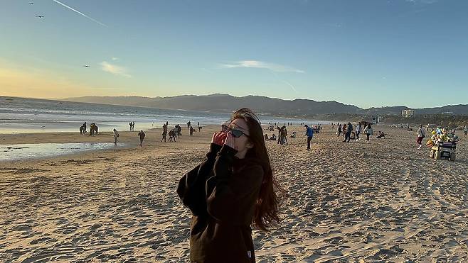 해변가에서 포착된 지연은 블랙 오버사이즈 후드 점퍼를 착용해 편안하면서도 스타일리시한 비치 룩을 선보였다. 선글라스와 자연스러운 웨이브 헤어스타일로 여유로운 분위기를 자아냈다.