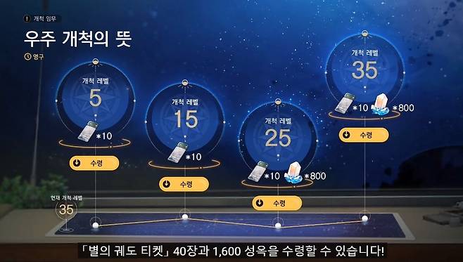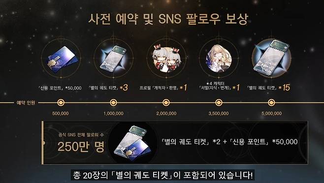 호요버스는 붕괴: 스타레일의 정식 출시에 맞춰 수십차례 뽑기를 진행할 수 있는 이벤트를 진행합니다. 7일 출석 보상으로 별의 궤도 전용 티켓 10장을 얻을 수 있고, 사전 예약 및 SNS 팔로우 보상으로 최대 별의 궤도 티켓을 20장까지 획득 가능하죠. 여기에 '우주 개척의 뜻'이라는 개척 레벨 달성 임무를 통해 총 뽑기 50회 상당의 보상을 받을 수 있다고 합니다.